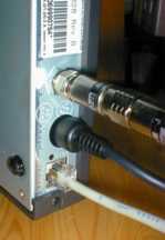 ケーブルモデムの裏側には3つの端子があります。上から順に、外のケーブル、電源アダプタ、Ethernetの端子です。ディップスイッチなどはなく、ともかくつなくだけです。また、マニュアルなどももらえなく、ともかくつないで使うのみです。 |