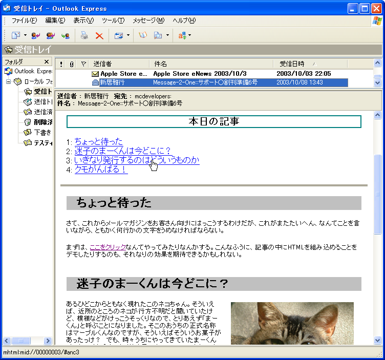 データベースからXML書き出しの機能を利用して、シングルパートのHTMLメールを作成します。これらのHTML生成ルールは、XSTLファイルとテキストファイルで記述されていますので、HTMLのデザインはそこの段階で自由に記述できます。ここではOutlook Express 6を使ってメールを受信してみました。