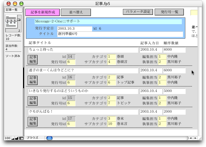 特定の発行号の記事の一覧を表示します。ここで、記事としてどのようなものがあるかを検討することもできます。記事が確定したら、執筆者の手配、そして記事が入校されたのかどうかといった管理などもこの画面でできます。記事はあらかじめ設定された2段階のカテゴリに応じて順序設定が可能ですが、「順序数値」を自分で変更することで、順序は自由に後から設定可能です。別の号に記事を移動させるということもできます。