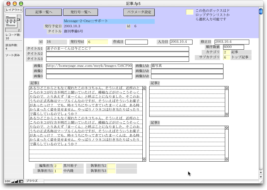 ファイルメーカーProで作ってある制作システムを御覧に入れます。こうした基本的なシステムをそのまま使うのもあるかもしれませんが、実用に際しては、独自にカスタマイズをされることが望ましいと思われます。
