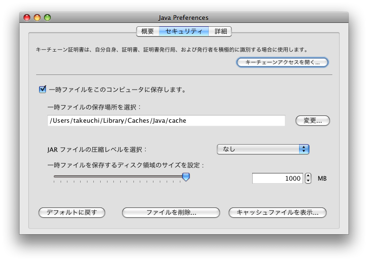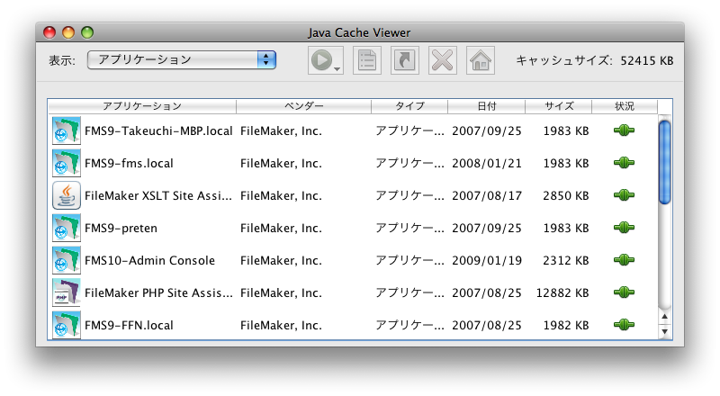 Ver.9をすでに使っていて、Ver.10にアップし、16000番ポートに接続して管理ツールのボタンをクリックして動かそうとしてもエラーで動かないということが発生するようです。筆者の場合は、キーチェーンにあるFileMakerの証明書を削除し、Javaのキャッシュのクリアで稼働できるようになりました。Javaのキャッシュは、ユーティリティフォルダの「Java」フォルダの「Java Preferences」を起動します。そして、「セキュリティ」のタブを選択して「キャッシュファイルを表示」のボタンをクリックします。すると、管理コンソールのJavaアプリケーションやPHP Site Assistantなどがキャッシュされているのが見えます。選択して、赤い「×」ボタンをクリックすると消去できます。これらを一度全部消してしまってから再度行ってみてください。ただし、これでもうまく行かなかったという人もいますので、すべての場合の解決策ではないようです。