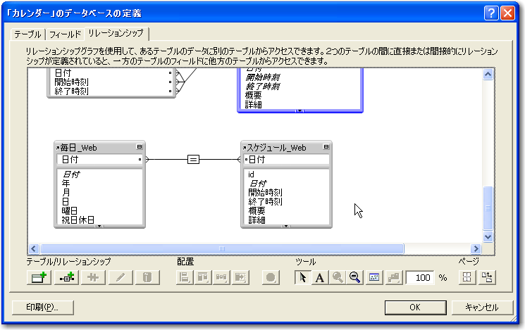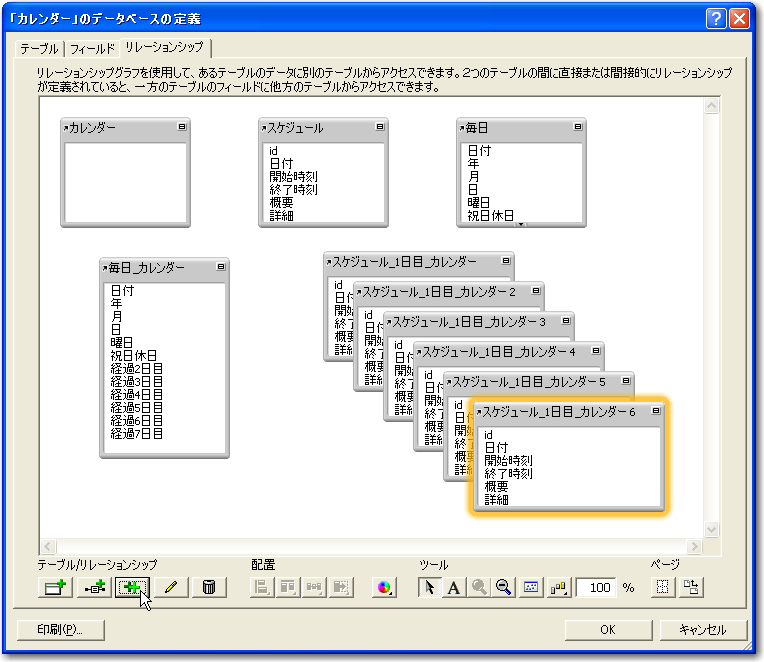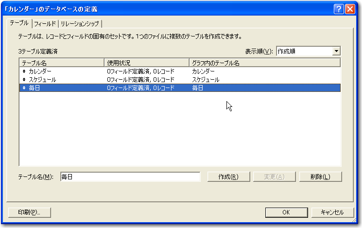 それでは、リレーションシップを実際に定義しましょう。まず、初期状態では、「カレンダー」「スケジュール」「毎日」というテーブルが存在しています。これらはとりあえず、そのままおいておき、新しいテーブルを用意してリレーションの定義を行います。つまり、これから作ろうとしているレイアウトなどに対応したテーブルをその都度作るという手法で進めていきます。