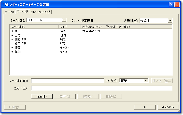スケジュールの説明は「概要」「詳細」としましたが、以後は「概要」フィールドだけを使います。実際には用途にあわせてフィールドを追加することになるでしょう。ここでは「カレンダー形式」という部分にしぼって解説を行います。