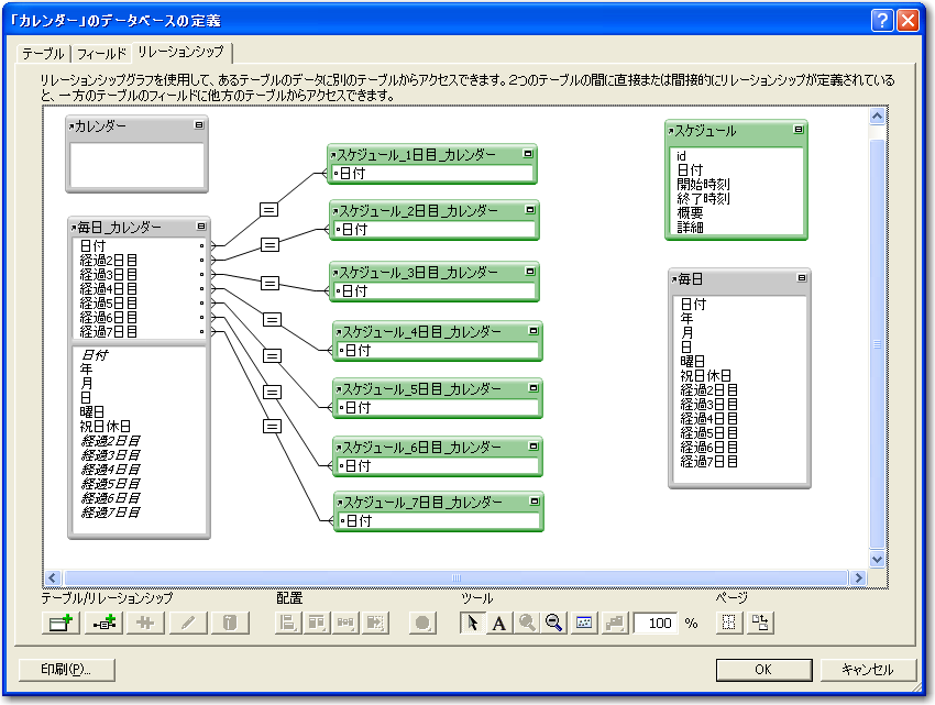 必要なテーブルを用意したら、リレーションを定義します。「毎日_カレンダー」テーブルの「日付」フィールドと、「スケジュール_1日目_カレンダー」テーブルの「日付」フィールドを結合します。同様に、「毎日_カレンダー」テーブルの「経過N日目」フィールドと、「スケジュール_N日目_カレンダー」テーブルの「日付」フィールドを結合します(N=1〜6)。