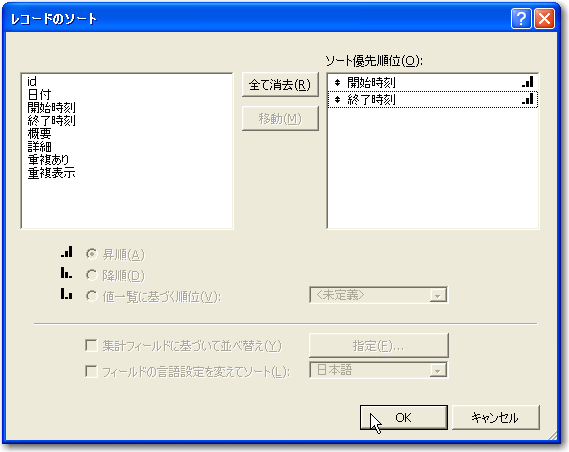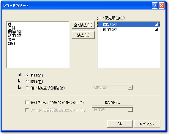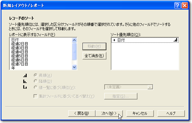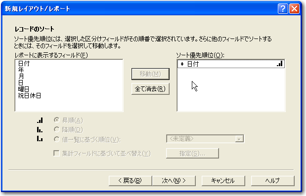 4「レコードのソート」では、「日付」フィールドをソート対象フィールドとして指定します。もちろん、昇順でソートします。