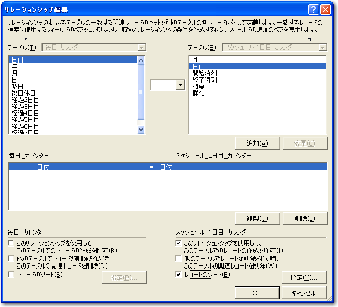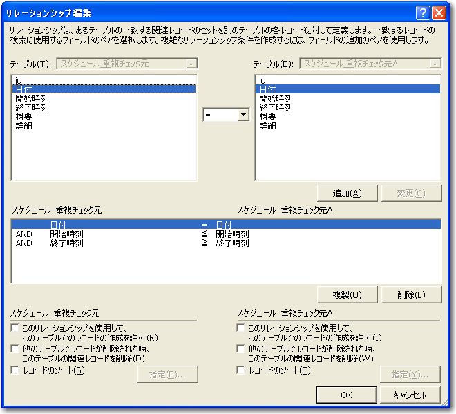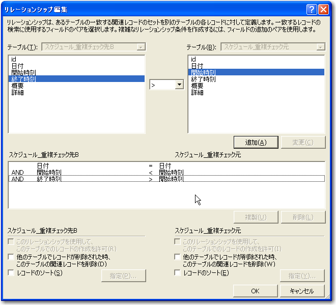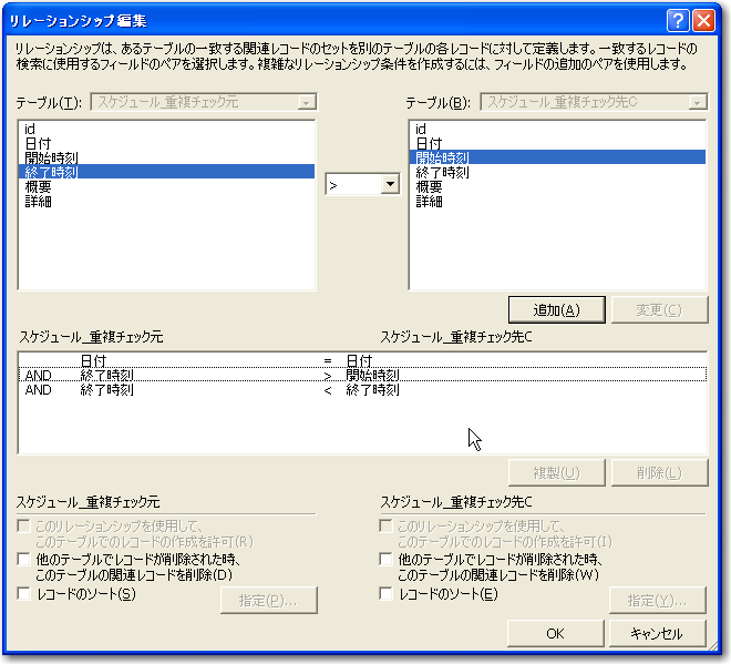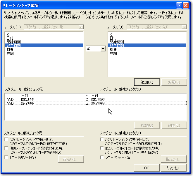 」の間でフィールド間をドラッグしますが、それぞれの「日付」と「終了時刻」をドラッグし、さらに前者の「終了時刻」と後者の「開始時刻」をドラッグします。そして、リレーションシプ編集で次の図のように条件を設定します。