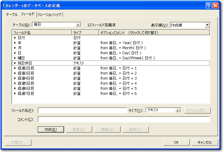 「祝日休日」は「春分の日」などの文字を入れることにします。これはどうしても手作業になります。なお、このフィールドが空欄なら祝日ないしは休日でないと判断することにします。もちろん会社の創立記念日で休業のような、データベースを使う範囲のローカルな行事を書き込んでもかまいません。