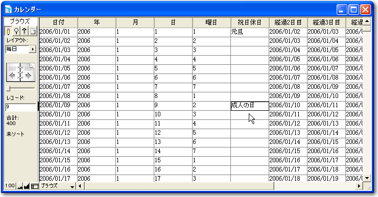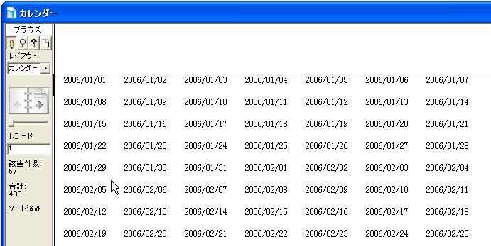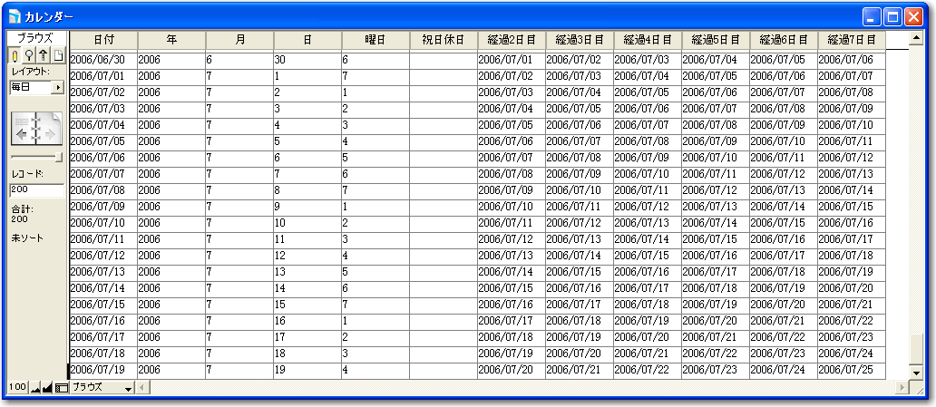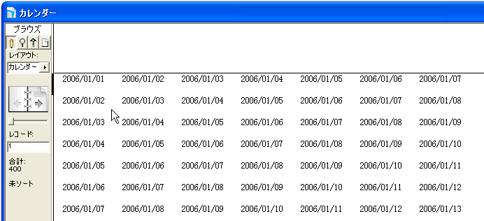 この状態で、一度ブラウズ表示してみます。もちろん、レコードに対しての検索は行っていないので、すべてのレコードが表示されます。図のように、1行目を見れば、1月1日から7日まで並んでいていいのですが、2行目は1月2日から、3行目は1月3日からとなっており、カレンダーのようにはなっていません。ここで考えるのは、1月1日を基準にすると、2行目は「1月8日から7日間」、3行目は「1月15日から7日間」といったような状況です。