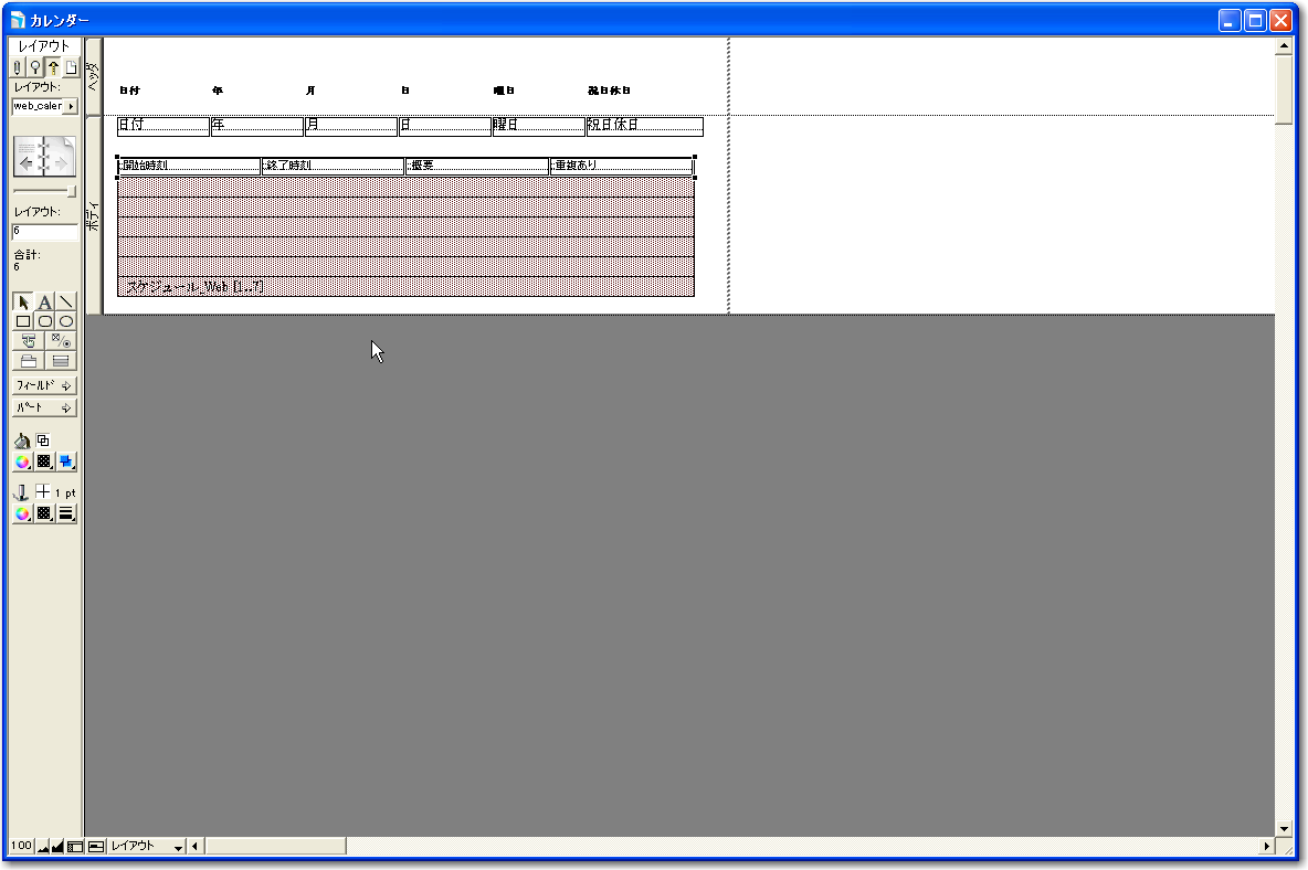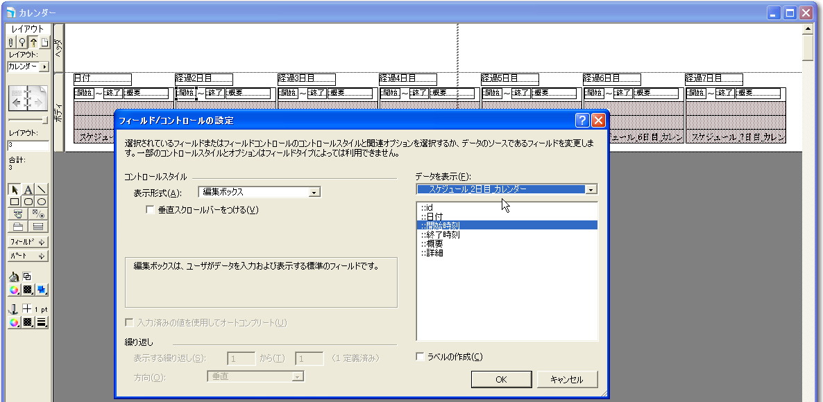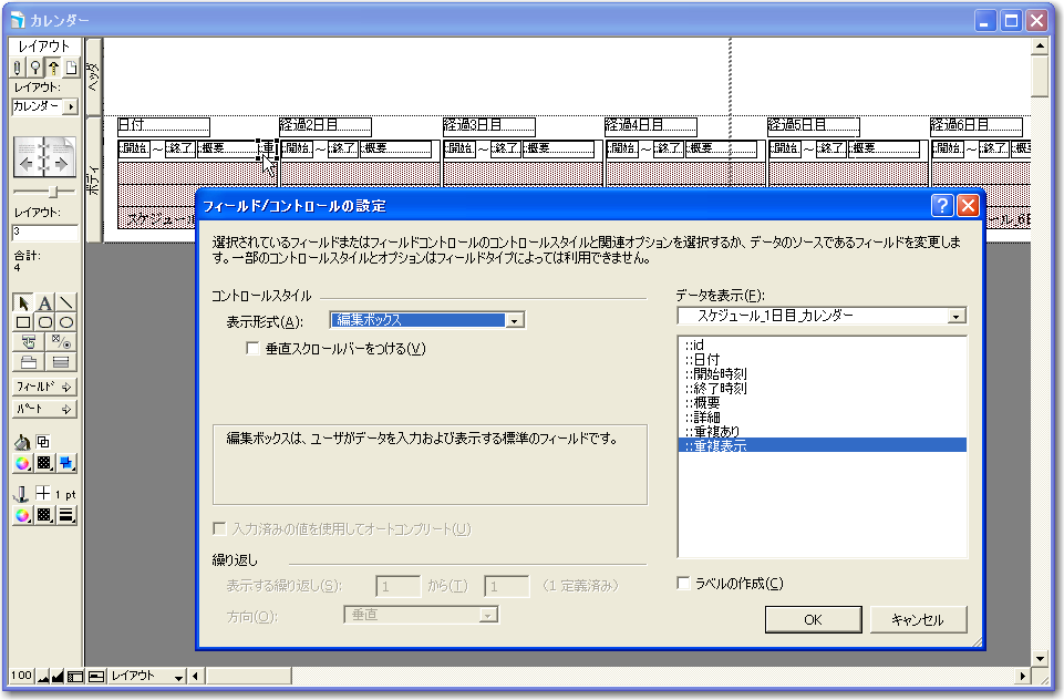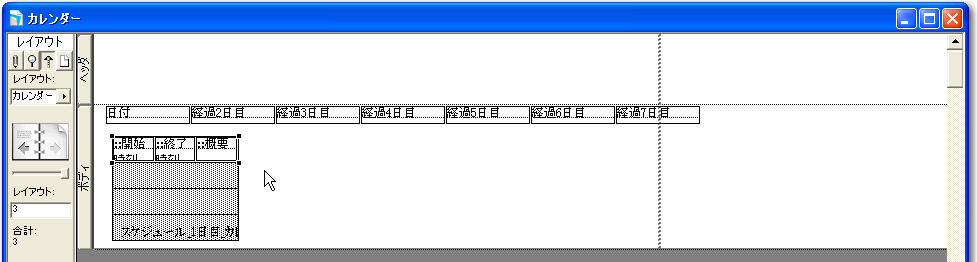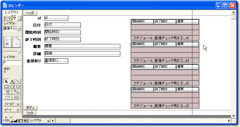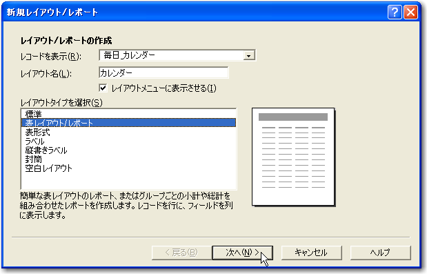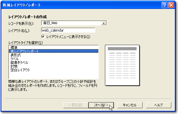 基本的なデータベースの定義ができたので、早速カレンダー形式に表示や入力が可能なレイアウトを作っていきましょう。以下、「新規レイアウト/レポート」のウィザードでのポイントとなる部分だけを示します。