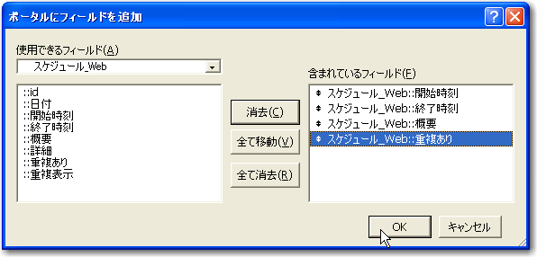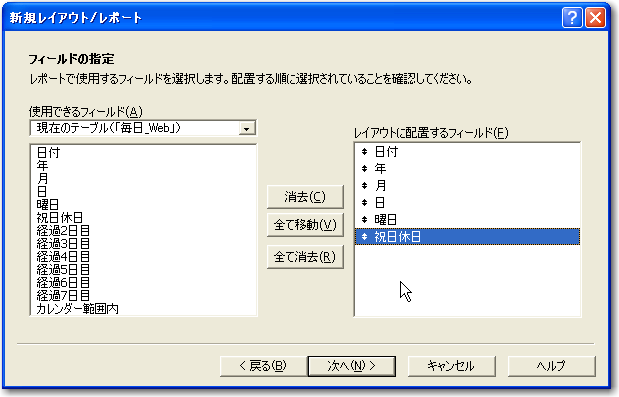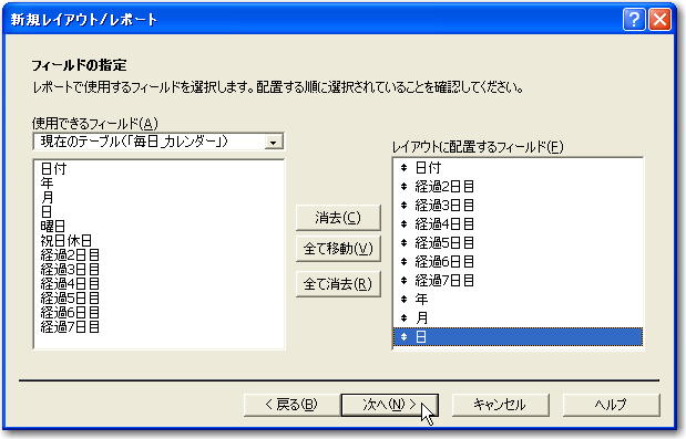 3「フィールドの指定」では、「日付」と「経過N日目」の合計7つのフィールドを必ず含めるようにします。(図では「年」「月」「日」がありますが、これは使いませんのでなくてかまいません。)