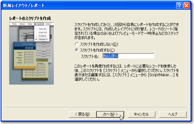 7「レポートのスクリプトを作成」では、「スクリプト作成する」を選択します。実用面ではスクリプトを利用しないと、正しくカレンダー形式に常に表示される訳ではありませんので、ここで定義しているレイアウトを表示するためのスクリプトは必ず作成します。