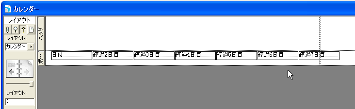 まず、作成したレイアウトの設計画面は次の図のようなシンプルなものです。要は日付が表示されるフィールドが横に並んでいればいいわけです。それがリスト表示になっていればかまいません。