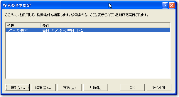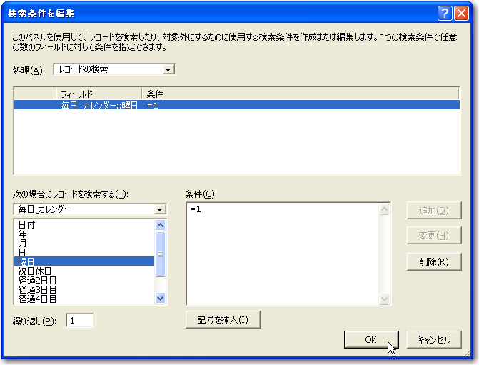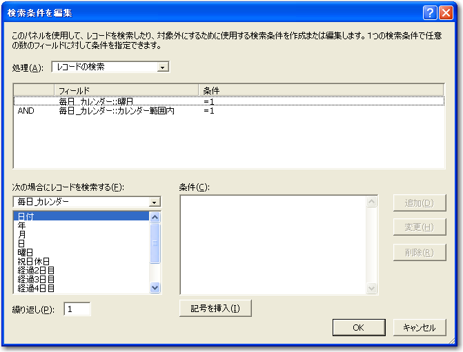 「検索実行」ステップの条件については、設定して記録しておきます。ここでは、「毎日_カレンダー」テーブルの「曜日」フィールドが「1」、つまり日曜日のレコードだけに絞り込むという検索条件を設定しました。