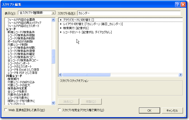 「カレンダー」レイアウトを表示するためのスクリプト「カレンダー」を修正しましょう。まず、スクリプト後半のプレビューモードに切り替えたり、もとのレイアウトに切り替える作業は不要なので、これらのステップは不要です。「ブラウズモードに切り替え」は最初にあるのがいいかもしれませんが、これは場合によっては不要です。念のために残しておきます。ソートについては「日付」でのソートが設定されているので、そのまま残しておきます。そして、レイアウトを「カレンダー」に切り替え、その後に「検索実行」のステップを追加して、さらにレコードをソートするステップを配置するようなスクリプトにします。