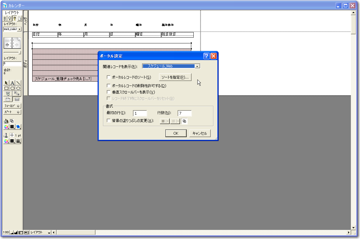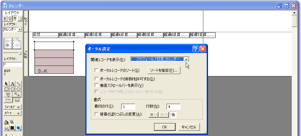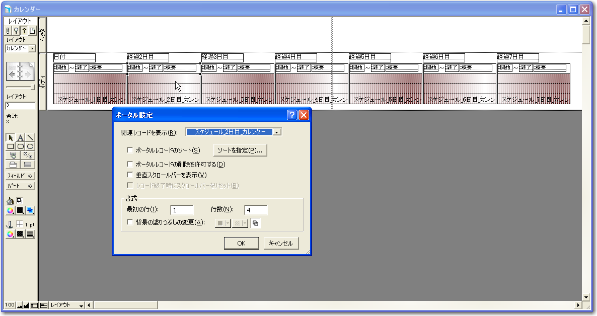 なお、複製したポータルやフィールドは設定そのものも複製されているので、ここからは地道に1つずつ設定を変えないといけません。以下の図のように、2つ目のポータルはダブルクリックをして関連レコードとして「スケジュール_2日目_カレンダー」を選択します。左から3つ目は「スケジュール_3日目_カレンダー」、4つ目は「スケジュール_4日目_カレンダー」、5つ目は「スケジュール_5日目_カレンダー」、6つ目は「スケジュール_6日目_カレンダー」、7つ目は「スケジュール_7日目_カレンダー」をそれぞれポータルの設定ダイアログボックスで選択し直します。そして、ポータルの位置にあわせて、「日付」〜「経過7日目」のフィールドの位置を調整します。