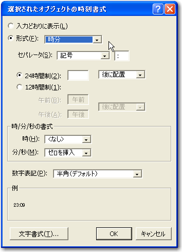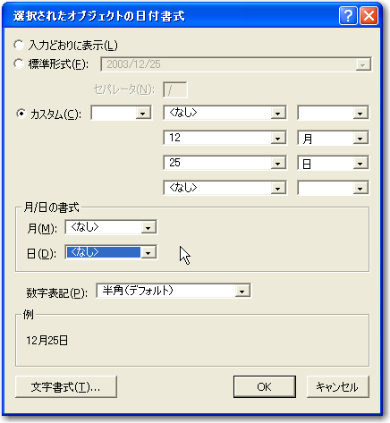 日付を表示する「日付」〜「経過7日目」のフィールドについては、ここでは月と日だけの表示でかまわないので、「書式」メニューの「日付」で表示されるダイアログボックスで、図のように「カスタム」を選択して、月と日だけが表示される設定に変えておきます。また、ポータル内の時刻を表示するフィールドでは、時と分だけでいいので時刻書式のダイアログボックスで形式を選択しておきます。
