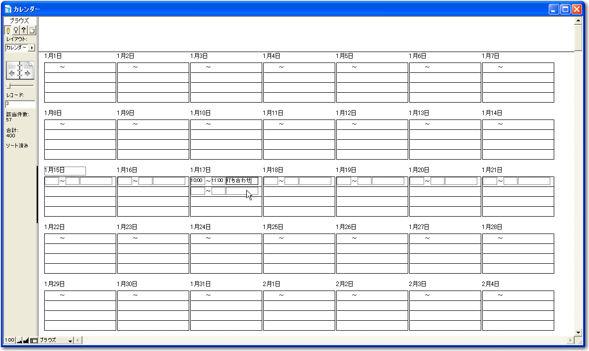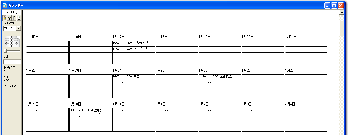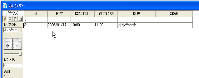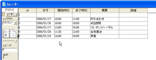 「カレンダー」レイアウトを表示します。場合によっては「カレンダー」スクリプトを表示してください。すると図のように、1月1日からのカレンダーが表示されます。たまたま、2006年の1月1日は日曜日なので、いちばん左に配置されています。ここで、図では、1月17日のポータルのところに、時刻と概要を入力して、スケジュールを入力しました。そして、レイアウトを「スケジュール」に切り替えると、「カレンダー」レイアウトで入力した新しいレコードが追加されているのが分かります。
