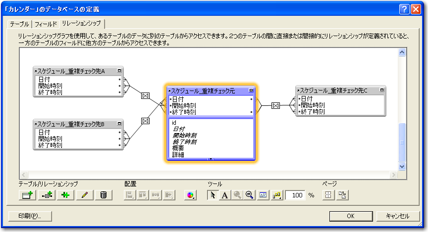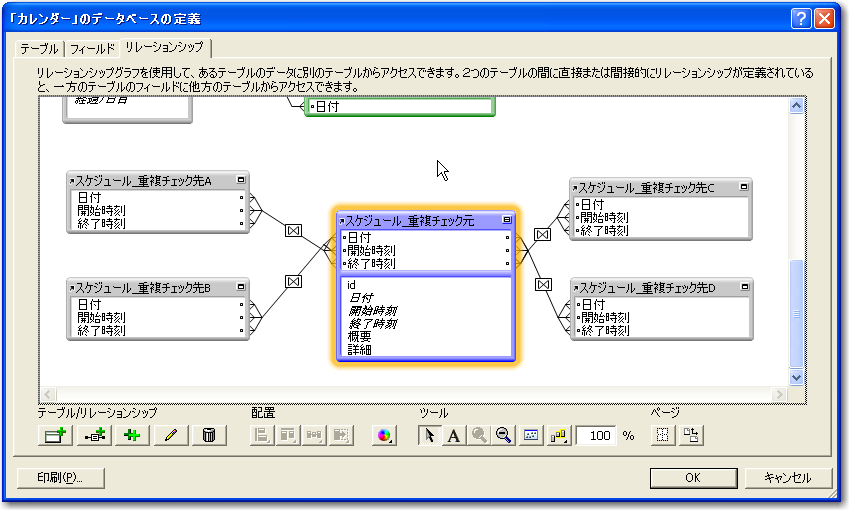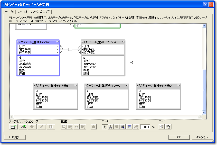 最終的にはリレーションシップの定義として、「スケジュール_重複チェック元」を中心に4系統のリレーションが定義されます。ところで、この4つのパターンはそれぞれ異なる判断をするのだからコンテキストは別であると考えられます。それならば、1つの「スケジュール」テーブルから4つにリレーションを設定するのではなく、1つの「スケジュール」と別の「スケジュール」のリレーションを4つ定義するのが正しくはないかとも考えられます。この考えはもちろん正しい考え方ですが、ここでは、そうしたコンテキストの完全な分離をしなくても問題はありません。なぜなら、この4つのコンテキストはすべて「スケジュール_重複チェック元」テーブルを基準に考えるからです。「スケジュール_重複チェック先A」などのテーブルからのコンテキストは考えないので、ここは分離しなくてもさほど混乱はないはずです。また、分離してしまうと、計算式の定義のフィールドを1つにまとめることができないので、ここではまとめた1つのコンテキストとして4つのリレーションを扱うことにします。
