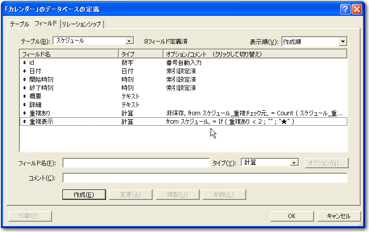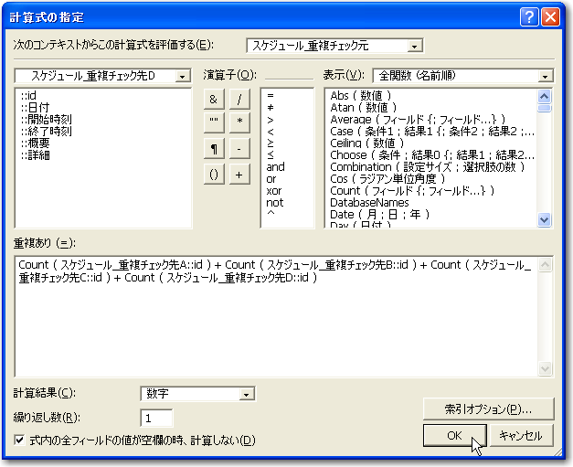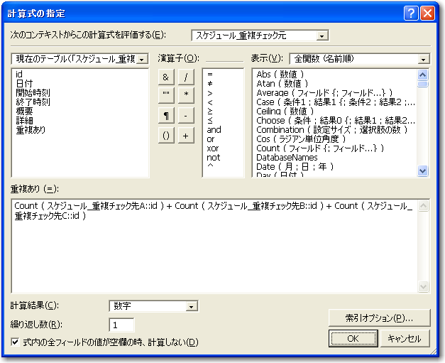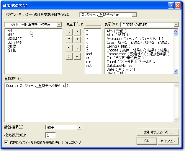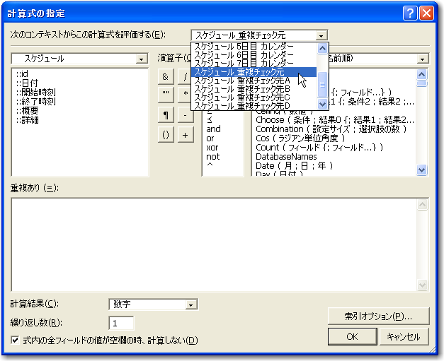 続いて重複があるかどうかをチェックする計算フィールドを定義します。ここでのポイントは、リレーション先に重複するテーブルが存在するかどうかを数えることです。つまりは、Count関数を使う訳です。フィールドの定義で「スケジュール」テーブル定義に計算フィールドを新しく追加します。ここではフィールドの名前を「重複あり」としました。フィールドを作成するときに計算式を指定しますが、このときに、「次のコンテキストからこの計算式を評価する」というドロップダウンリストで、「スケジュール_重複チェック元」を選択します。コンテキストをこのテーブルを基準に評価するということを、式の方に指定する必要がある訳です。