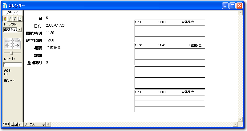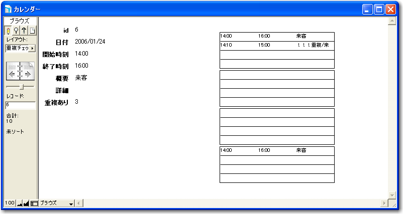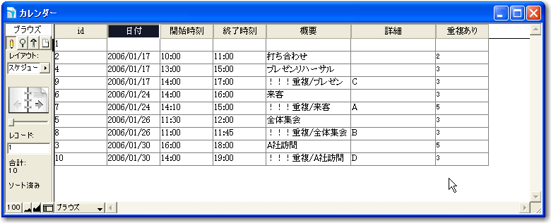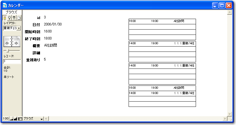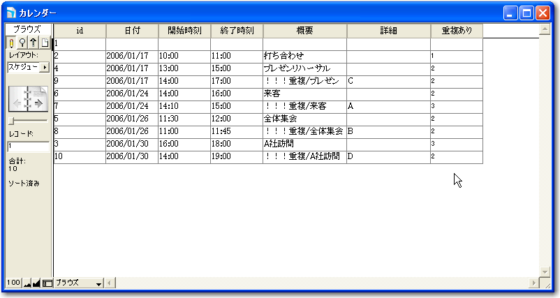 そして、「スケジュール」レイアウトで「重複あり」の結果を見てみます。図のようになりますが、結果的には重複ありの値が2以上であれば、重複レコードがあると判断できるということになります。ここでは、「重複チェック」フィールドでの結果は確認しませんが、前に示した結果から、パターンDに対応したポータルの部分がなくなったと考えればいいでしょう。