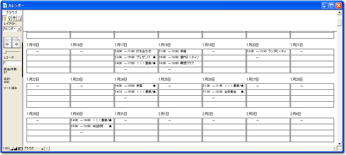こうしていくつかの日付のポータルのところに、新しくスケジュールを入れていきます。図では、1月17日のところは2つのスケジュールを入力しました。いくつか入力したスケジュールは、「スケジュール」レイアウトで一覧で確認すると確かに追加されていますし、正しい日付になっています。