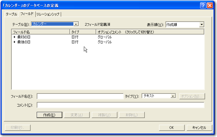 まず、データベースファイルを作ると、同名の「カレンダー」という名前のテーブル定義が作られていますが、当初はこちらのテーブルは使わないでおきます。あとから、グローバルフィールドを確保するために使います。このテーブル以外に、1件のスケジュールを1レコードとして管理する「スケジュール」テーブル定義、そして1日を1レコードとして記録する「毎日」テーブル定義を作ります。