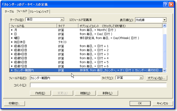 さらに、「毎日」テーブルに、その日が範囲内にあるのかどうかを判断するための計算フィールド「カレンダー範囲内」を「毎日」のテーブル定義に追加します。計算式は以下の通りです。つまり、2つのグローバルフィールドの範囲内の日付なら1、それなければ0になるというものです。