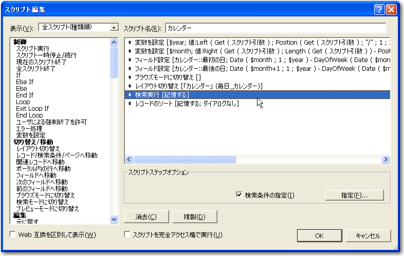 そして、「カレンダー」スクリプトを修正しますが、何年の何月を表示するのかということをスクリプト引数で指定するようにします。たとえば「2006/5」のように、年と月をスラッシュで区切って引数を指定するというようにしておき、スクリプトでスラッシュの前後の文字列を得て、望むデータをそれぞれのグローバルに設定をするようにします。マクロは次のようなものですが、最初の4つのステップの式は別に書き出しておきます。また、「検索実行」ステップの条件として、「カレンダー範囲内」フィールドが1であるというものを追加しました。