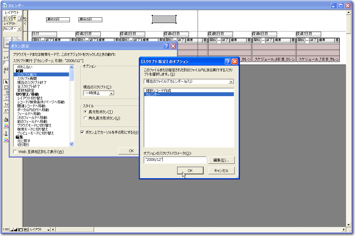 この「カレンダー」スクリプトの呼び出し方法ですが、たとえば、ボタンに固有の年月の呼び出し機能を割り当てたいのであれば、ボタンの動作としてスクリプトの実行を指定し、「カレンダー」スクリプトを実行するようにします。このときの「オプションのスクリプトパラメータ」で、「"2006/12"」のようにダブルクォートで文字列をかこって指定して、文字列としてスクリプトの引数として与えられるようにします。たとえば、このボタンだと、「2006年12月」とラベル表示をしておき、クリックすると12月が表示されるようにします。もちろん、月ごとのボタンを用意するというのが一つの解決策でしょう。