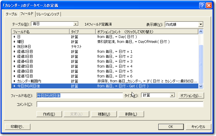 さらに「経過2日目」〜「経過7日目」までの計算フィールドに注目してください。「日付」フィールドの値の次の日、その翌日と、「日付」からスタートして、1週間分の日付がこれらのフィールド自動的に得られます。