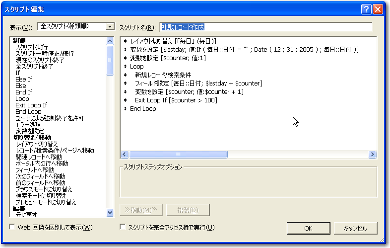 「毎日」テーブルには、1日1レコードを作ることになります。いろいろな方法はあるかとは思いますが、何かしらのマクロを用意しておいて、定期的に実行するのが適切かと思います。ここでは、図のような「複数レコード作成」というスクリプトを作りました。このスクリプトは、「毎日」テーブルに全くレコードがない状態であれば、2006年1月1日以降のレコードを作ります。もし、すでにレコードが存在する場合は、いちばん最後の日のレコードを選択した状態でスクリプトを実行します。実行時に選択しているレコードの「日付」フィールドの翌日からのレコードを作ります。使用するときには注意をしてほしいのですが、もちろん、いろいろと凝れば自動的に追加も可能です。ここではサンプルを簡単にするために完全なスクリプトではないことをお許しください。なお、スクリプトは、ある日から100日分のレコードを作りますが、スクリプトを修正すればその日数は変更できます。スクリプトは変数を使っていますので、FileMaker 8以降でないと同じようには作成できません。