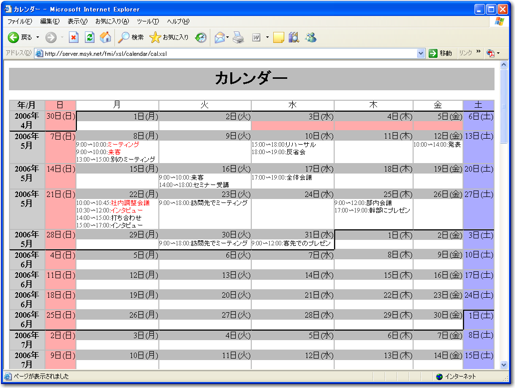 なお、この方法で2006年5月のカレンダーを出したとき、4月30日や6月1日も見えています。通常のカレンダーだと、該当していない月の日は小さく表示したり薄く表示したりしていますが、このアプリケーションではここまでところでは特にそれらしい表示はしていません。
