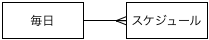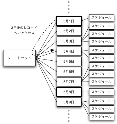 この「経過N日目」フィールドを説明するのに、データベースのスキーマを解説しなければなりません。このデータベースのテーブル間の関連は実にシンプルで図の通りです。つまり、あるスケジュールは、特定の日のものとなるので、逆に1日が複数のスケジュールを持つという1対多の関係があるというだけです。