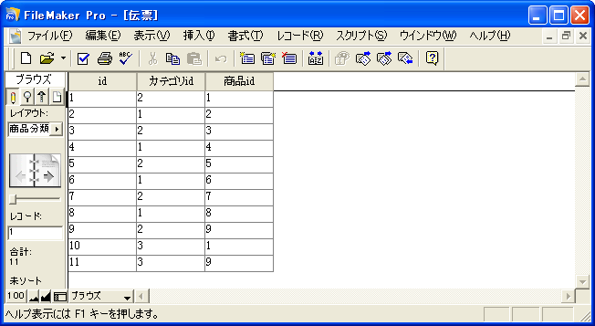 なお、「商品分類」テーブルのidフィールドには連番をいちおう入れていますが、この段階では、特に意味のあるデータとしての取り扱いはしていません。