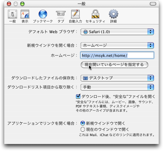 Safariメニューから環境設定を選択します。ウインドウで一般のタブを選択してください。そこのホームページにアドレスがあることを確認して、現在開いているページを指定するのボタンをクリックしてください。