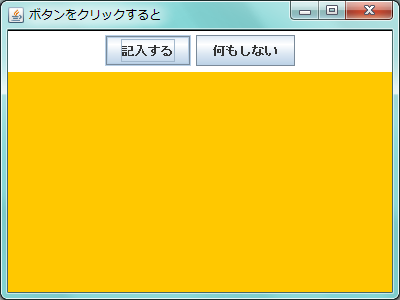 package swinggui; import java.awt.*; import javax.swing.*; public class ButtonAction1 extends JFrame { private static final long serialVersionUID = 1L; JPanel contentPane = new JPanel(); JButton activeButton, noActionButton; JTextArea messages; // フレームのビルド public ButtonAction1() { this.setBounds(0 ,0, 400, 300); this.setTitle("ボタンをクリックすると"); contentPane.setLayout(new FlowLayout()); contentPane.setBackground(Color.white); activeButton = new JButton("記入する"); contentPane.add(activeButton); noActionButton = new JButton("何もしない"); contentPane.add(noActionButton); messages = new JTextArea("メッセージ開始¥n", 12, 60); messages.setLineWrap(true); messages.setBackground(Color.orange); contentPane.add(messages); this.setContentPane(contentPane); this.setVisible(true); } }