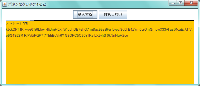 「何もしないボタン」をクリックしても、特に何も起こらないはずです。「記入する」ボタンをクリックすると、テキストエリアにランダムな文字が10文字追加されて行きます。何度もクリックしてみてください。また、JBuilderのコンソールをみると、「Actionイベントが発生しました。」と表示されているはずです。前のプログラムと比較すると、「ボタンのクリックに反応した」という重要な機能的な違いがあることをよく認識してください。