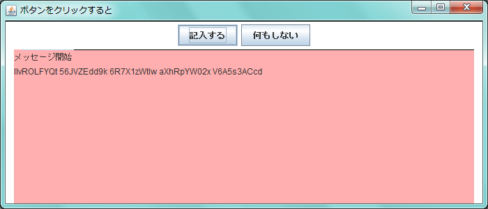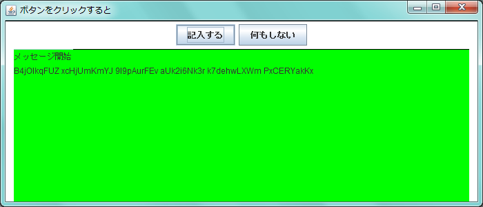 package swinggui; import java.awt.*; import java.awt.event.*; import javax.swing.*; public class ButtonAction2 extends JFrame { private static final long serialVersionUID = 1L; JPanel contentPane = new JPanel(); JButton activeButton, noActionButton; JTextArea messages; public ButtonAction2() { this.setBounds(0, 0, 700, 300); this.setTitle("ボタンをクリックすると"); contentPane.setLayout(new FlowLayout()); contentPane.setBackground(Color.white); activeButton = new JButton("記入する"); activeButton.addActionListener(new ActionListener() { public void actionPerformed(ActionEvent e) { clickButton(e); } }); contentPane.add(activeButton); noActionButton = new JButton("何もしない"); contentPane.add(noActionButton); messages = new JTextArea("メッセージ開始¥n", 12, 60); messages.setLineWrap(true); messages.setBackground(Color.green); contentPane.add(messages); this.setContentPane(contentPane); this.setVisible(true); } private String alfabets[] = { "A", "B", "C", "D", "E", "F", "G", "H", "I", "J", "K", "L", "M", "N", "O", "P", "Q", "R", "S", "T", "U", "V", "W", "X", "Y", "Z", "a", "b", "c", "d", "e", "f", "g", "h", "i", "j", "k", "l", "m", "n", "o", "p", "q", "r", "s", "t", "u", "v", "w", "x", "y", "z", "0", "1", "2", "3", "4", "5", "6", "7", "8", "9" }; public void clickButton(ActionEvent e) { System.out.println("Actionイベントが発生しました。"); StringBuffer currentText = new StringBuffer(messages.getText()); for (int i = 0; i < 10; i++) { int index = (int) (Math.random() * alfabets.length); currentText.append(alfabets[index]); } currentText.append(" "); messages.setText(currentText.toString()); } }