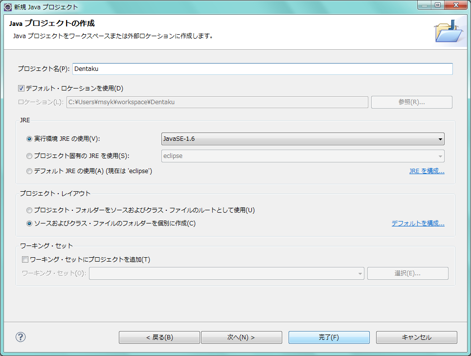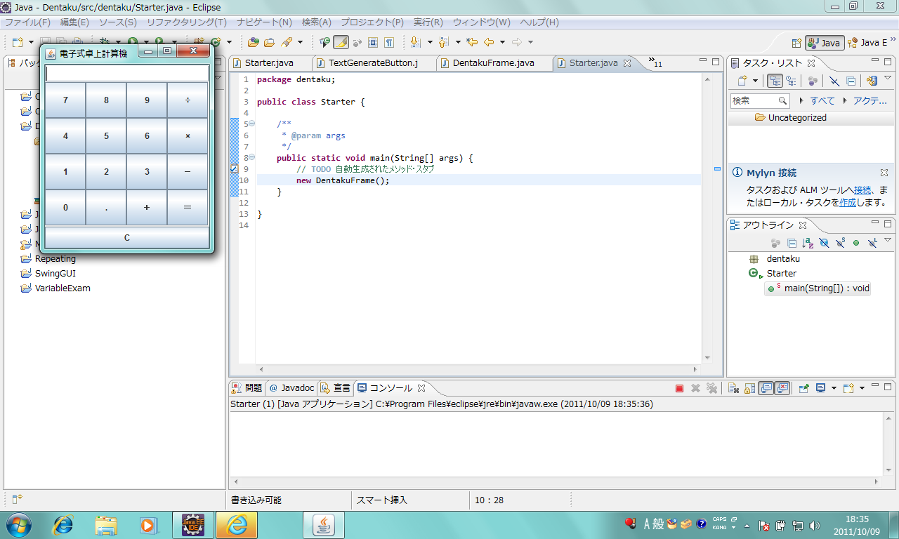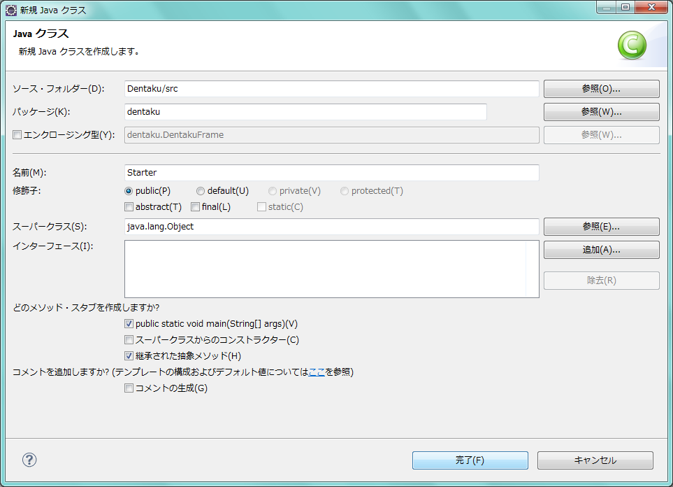 まずは、プロジェクトを新たに作成します。今週は「Dentaku」という名前のプロジェクトを作成することにします。そのプロジェクトに、アプリケーションを作ります。実際の電卓のクラスは、javax.swing.JFrameをスパークラスとした「Dentaku」クラスとします。そして、そのクラスを実行するためのStarterクラスも定義します。作業手順は今まで通りですので、以下、ポイントになる画面ショットのみを掲載します。