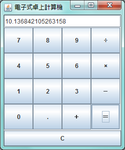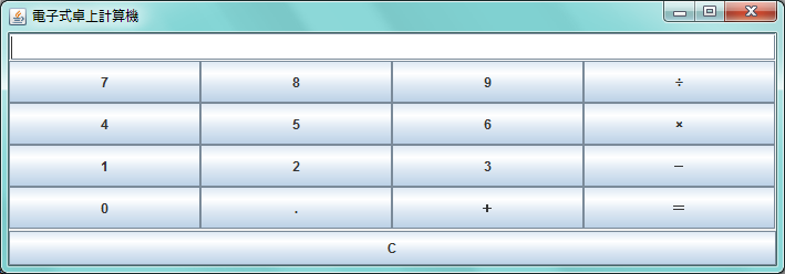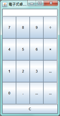 package dentaku; import java.awt.*; import java.awt.event.*; import javax.swing.*; public class Dentaku extends JFrame { private static final long serialVersionUID = 1L; JPanel contentPane = new JPanel(); BorderLayout borderLayout1 = new BorderLayout(); JTextField result = new JTextField(""); //計算結果を表示するテキストフィールド //フレームのビルド public Dentaku() { contentPane.setLayout(borderLayout1); this.setSize(new Dimension(250, 300)); this.setTitle("電子式卓上計算機"); this.setContentPane(contentPane); contentPane.add(result, BorderLayout.NORTH); //テキストフィールドを配置 JPanel keyPanel = new JPanel(); //ボタンを配置するパネルを用意 keyPanel.setLayout(new GridLayout(4, 4)); //4行4列のGridLayoutにする contentPane.add(keyPanel, BorderLayout.CENTER); keyPanel.add(new JButton("7"), 0); //ボタンをレイアウトにはめこんでいく keyPanel.add(new JButton("8"), 1); keyPanel.add(new JButton("9"), 2); keyPanel.add(new JButton("÷"), 3); keyPanel.add(new JButton("4"), 4); keyPanel.add(new JButton("5"), 5); keyPanel.add(new JButton("6"), 6); keyPanel.add(new JButton("×"), 7); keyPanel.add(new JButton("1"), 8); keyPanel.add(new JButton("2"), 9); keyPanel.add(new JButton("3"), 10); keyPanel.add(new JButton("-"), 11); keyPanel.add(new JButton("0"), 12); keyPanel.add(new JButton("."), 13); keyPanel.add(new JButton("+"), 14); keyPanel.add(new JButton("="), 15); contentPane.add(new JButton("C"), BorderLayout.SOUTH);//Cボタンを配置する this.setVisible(true); } }