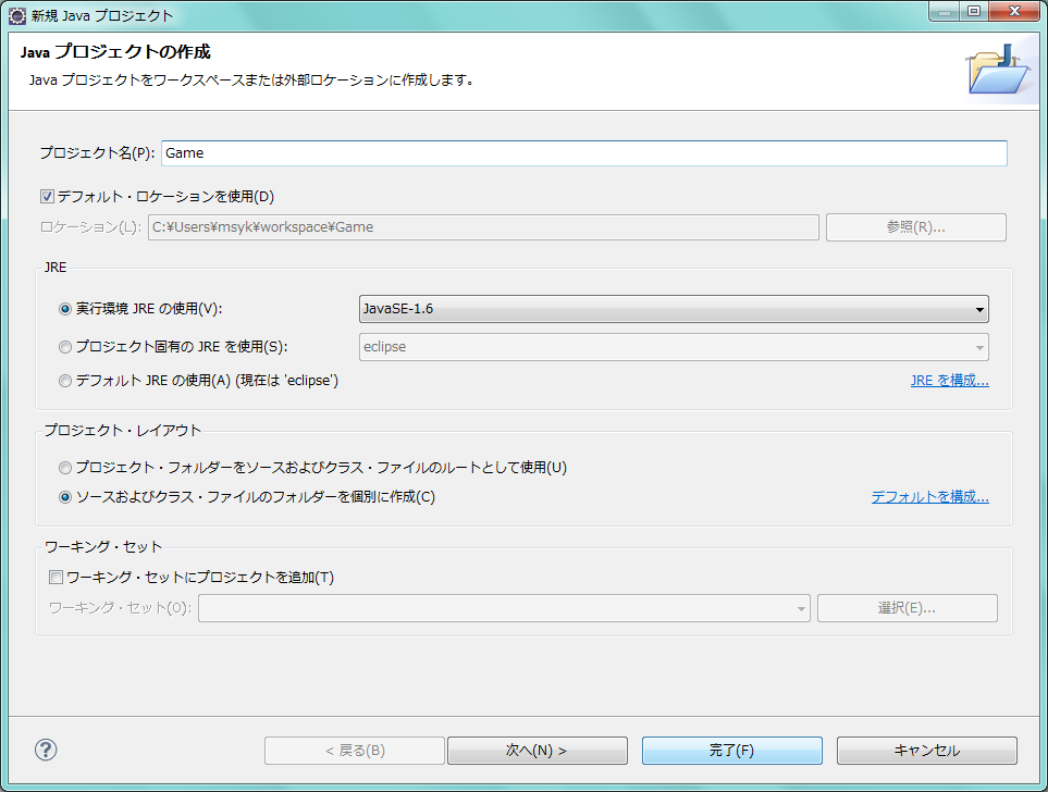 まず、プロジェクトを新たに作成します。今週は「Game」という名前のプロジェクトを作成することにします。そのプロジェクトに、アプリケーションを作ります。実際の電卓のクラスは、javax.swing.JFrameをスパークラスとした「Mogura」クラスとします。このMoguraクラスのパッケージは「mogura」とし、「public static void main(String[] args)」のチェックを入れておきます。