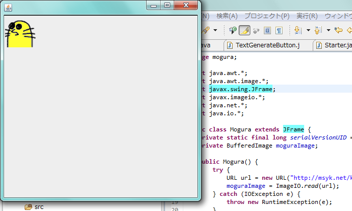 Mogura.javaに次のようなプログラムを入力して、実行してみてください。単に、ウインドウにもぐらの絵が出てくるだけだとは思いますが、基本的なところから少しずつ作っていきましょう。