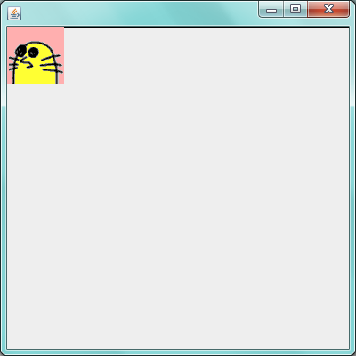 Moguraクラスのコンストラクタの最後に、newキーワードでImageCanvasオブジェクトが生成されています。引数には、もぐらのGIF画像が指定されています。そして、生成したImageCanvasは、addメソッドにより、ウインドウの中に表示されます。ボタンなどと同じく、ImageCanvasもgetContentPaneメソッドの値に対してaddメソッドで追加します。ここではBorderLayoutなので、適当な位置に表示されますが、まずは表示されることを確かめたいので、これで十分でしょう。