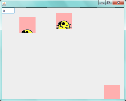 もぐらがサングラスをかけている…というのは、きっと筆者が子供のころに見たどなたかのマンガの影響が大きくあるかと思いますが、ご了承いただくことにしたいと思います。なお、もぐらは、ここでは黄色く塗りつぶしてありますが、モグラの外側は、適当な色で塗りつぶして透過色として設定してあります。Javaの描画処理では、GIFの透過色はきちんと認識されて、透過色となります。