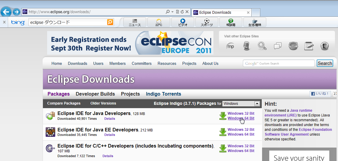 1Webブラウザで「http://www.eclipse.org/downloads/」にアクセスをします。ページ上の「Eclipse IDE for Java Developers」を選択します。使用するOSのアーキテクチャに応じて、「WIndows 32 Bit」あるいは「Windows 64 Bit」を選択します。(アーキテクチャを調べるには、スタートメニュー→「コントロールパネル」→「システムとセキュリティ 」→「システム」と進んで表示されるウインドウで「システムの種類」で確認できます。)