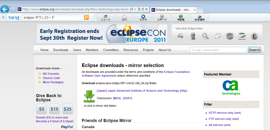 Windowsには標準では残念ながらJavaのコンパイラは付属していません。Microsoft社からもフリーの開発ツールも配布されていますが、ここでは数多くの開発者が使っているオープンソースでフリーで配布されている「Eclipse」をインストールして利用することにします。Eclipseのソースから、さまざまな形態の開発ツールが作られています。Javaのプログラムを作るという点では以下の手順で示されている「Eclipse IDE for Java Developers」をダウンロードするのがいいでしょう。なお、日本語版をインストールしたい場合には、「●日本語版Eclipseをインストールする」の手順で作業を行ってください。