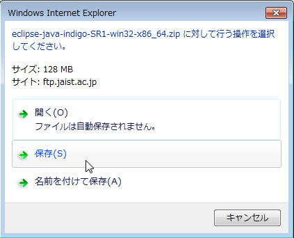 3ダウンロードが開始されると、ダウンロードしたファイルの処置を選択するダイアログボックスが表示されるので、ここでは、「保存」ボタンをクリックします。