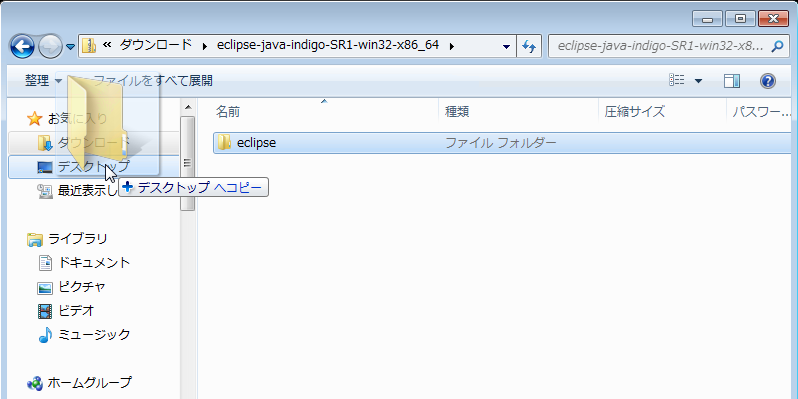 2デスクトップにある「eclipse」という名前のフォルダを、Cドライブのルートにある「Program Files」にドラッグ&ドロップして、このフォルダを「Program Files」の中にあるようにします。なお、圧縮ファイルを開いたウインドウから直接「Profram Files」フォルダにドラッグ&ドロップしてインストールできる場合もありますが、それでうまくいかない場合は一度ログインしているユーザが読み書き可能な「デスクトップ」などにファイルを展開してから移動することでうまく行きます。