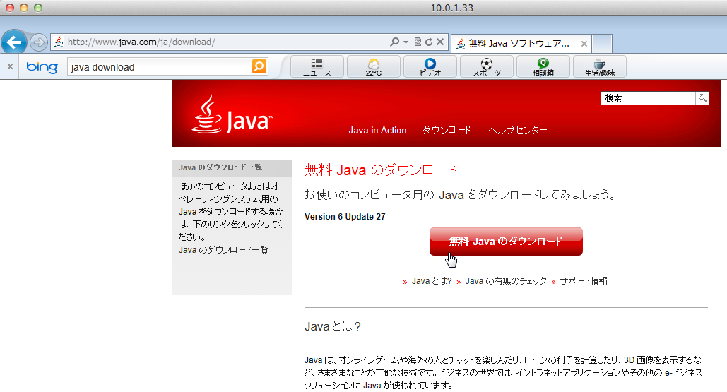 1Webブラウザで、「http://www.java.com/ja/download/」というアドレスのサイトに接続します。「無料のJavaのダウロード」をクリックします。(本来はこのページでJavaのバージョンを確認するために参照します。)