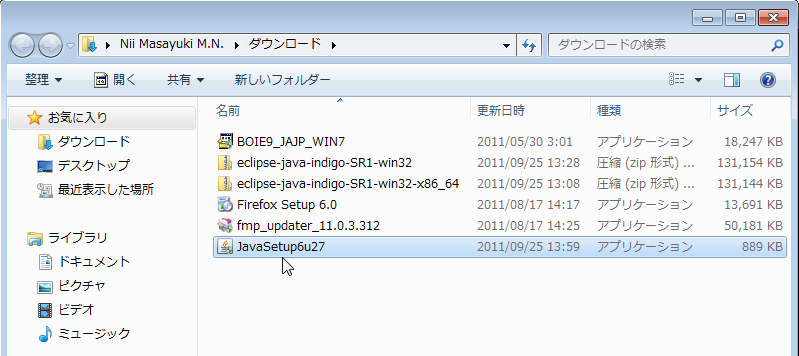 4ダウンロードしたファイル「JavaSetup6u27」が「ダウンロード」フォルダにあります。このファイルをダブルクリックします。